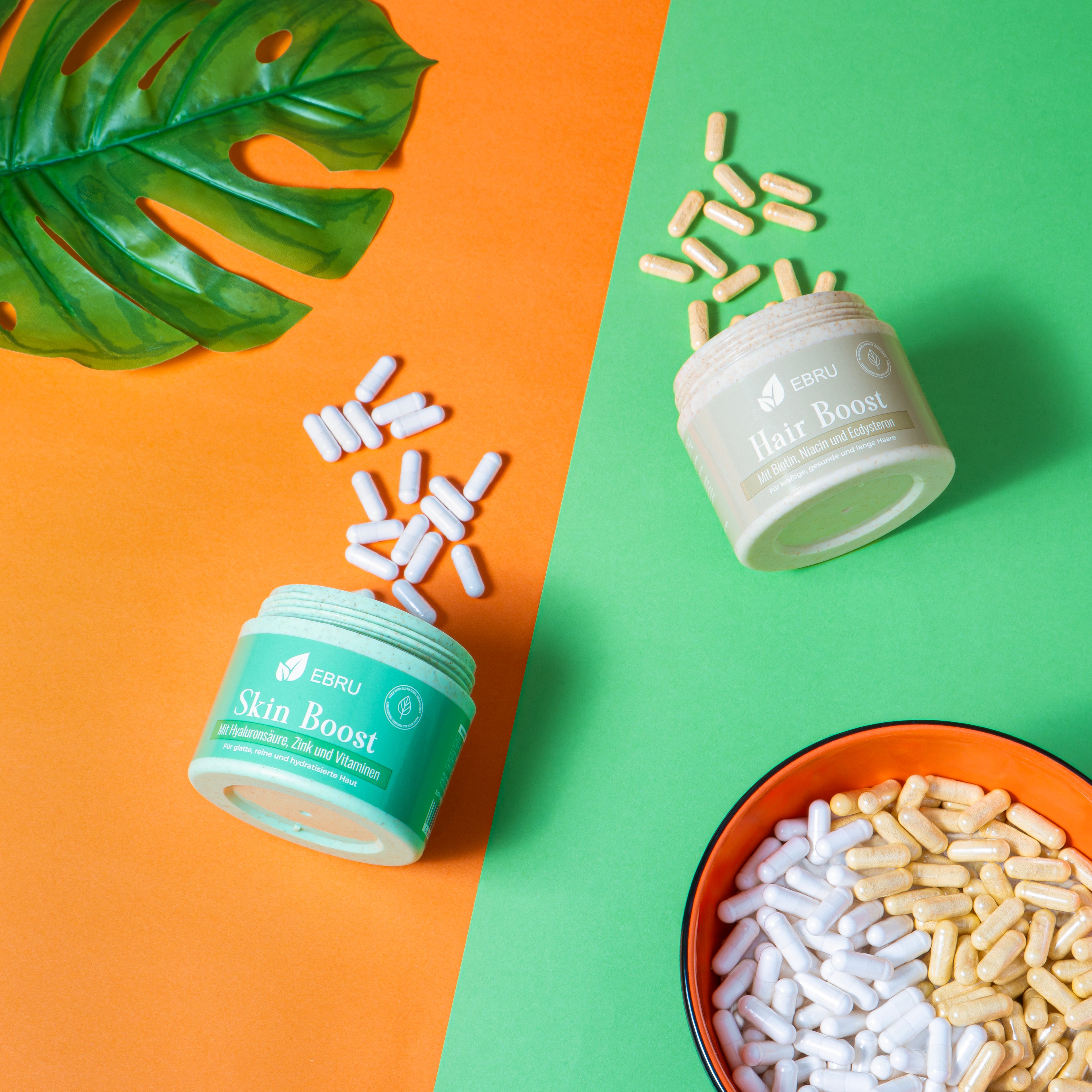 Skin Boost und Hair Boost sind hochwertige Nahrungsergänzungsmittel in Kapselform. Skin Boost ist speziell formuliert, um die Haut von innen heraus zu pflegen, während Hair Boost dazu entwickelt wurde, das Haar von innen zu stärken.